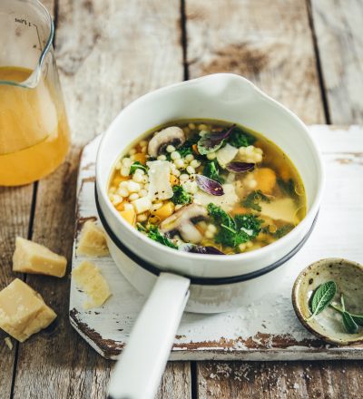 Faites chauffer un peu d’huile d’olive dans une grande casserole. Ajoutez l’oignon émincé et faites-le revenir quelques minutes. Ajoutez ensuite les morceaux de topinambours et de pomme de terre, couvrez de bouillon et portez à ébullition. Laissez cuire à feu doux 25 minutes.