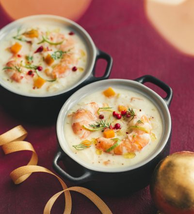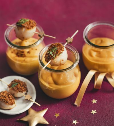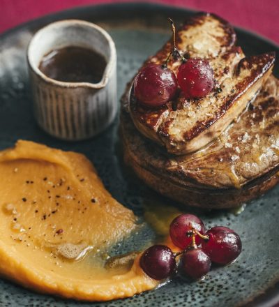 Dressez la crème de topinambours dans des bols ou des assiettes creuses. Déposez délicatement quelques copeaux de foie gras sur le dessus de chaque assiette. Ajoutez les fruits secs et servez sans attendre.