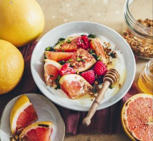 Pomelos rôtis au miel, yaourt à la grecque et pistaches
