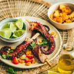 Pour tous les amateurs de poulpe, découvrez nos brochettes de tentacule de poulpe chimichurri. Le chimichurri est une persillade originaire d’Argentine aux notes relevées. Cette sauce convient parfaitement avec le poulpe ! Vous pouvez les cuire à la poêle ou à la plancha sur feu vif pendant 3/4 min de chaque côté. Au four pendant 15 min à 200° ou alors pour les plus gourmands d’entre vous, vous pouvez également les cuisiner au barbecue !