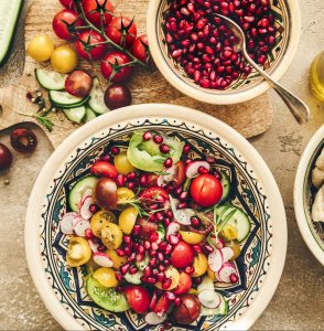 Salade fraîcheur de concombre, tomates, radis et grenade