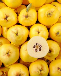 Le coing a un parfum reconnaissable de tous. Il a une particularité c’est que le coin se déguste exclusivement cuit ! Vous pouvez le cuisiner en crumble ou en pâtes de fruits, un vrai régal !
