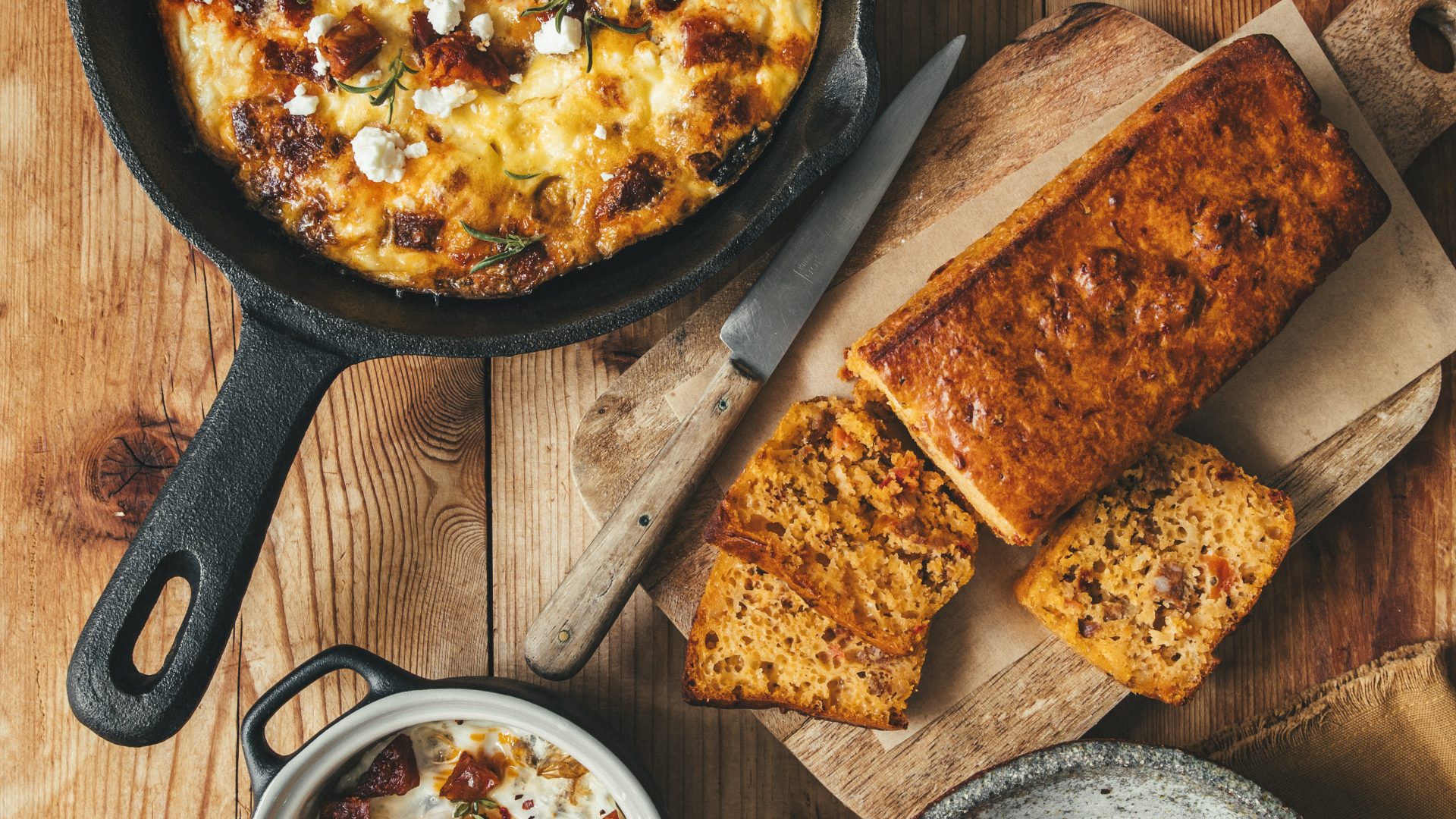Réalisez un délicieux cake avec des dés de chorizo, des tomates séchées et du gruyère râpé.
