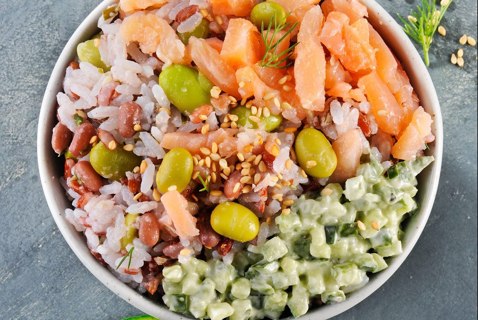 Méli-mélo de riz, saumon fumé et tartare de concombre