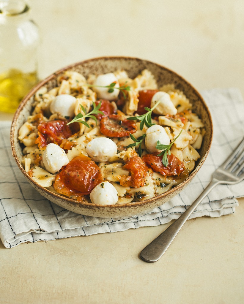 mini farfalles, tomates marinées et mozzarella.