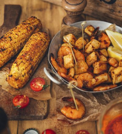 Piquez les crevettes sur les brochettes. Enfournez pour 6 à 8 minutes de cuisson au four ou faites-les griller 2 minutes de chaque côté sur la plancha ou au barbecue !