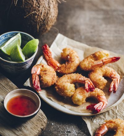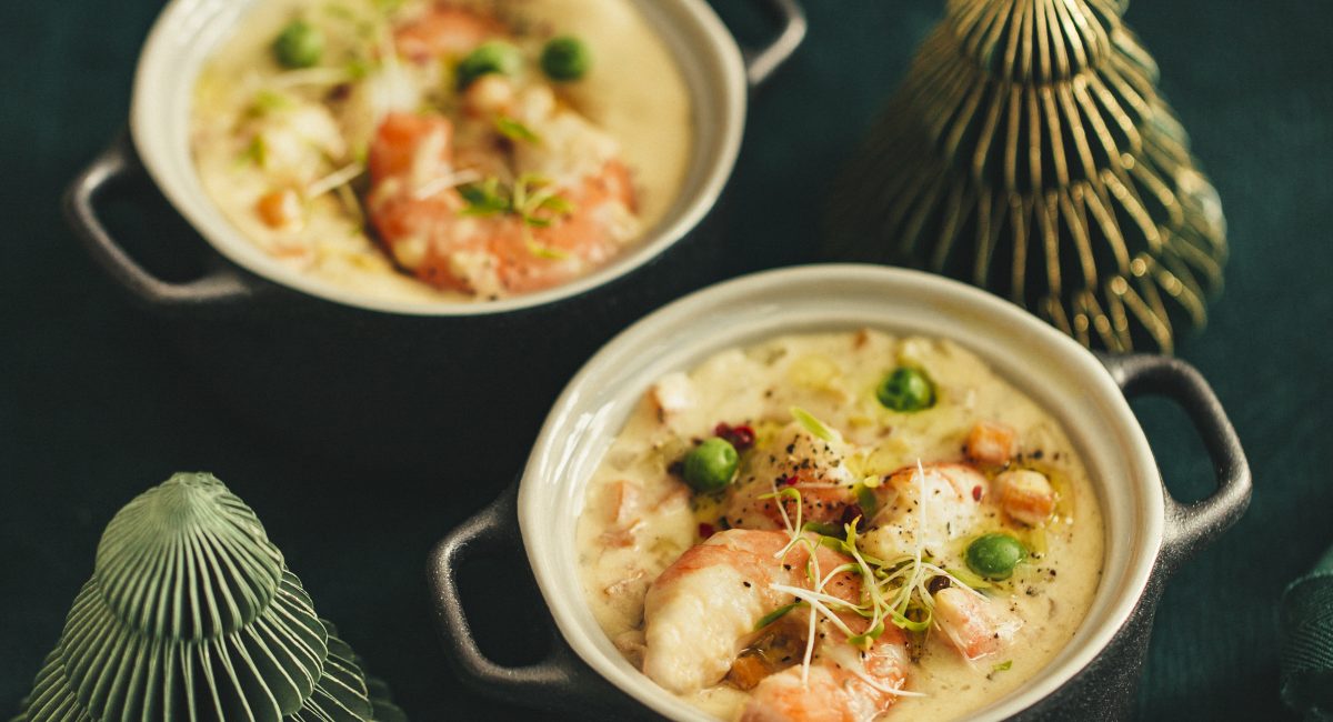 Pendant ce temps, décortiquez les crevettes. Ajoutez-les à la préparation et poursuivez la cuisson pendant 5 minutes. Assaisonnez de sel et de poivre. Décorez de coriandre hachée et servez sans attendre.