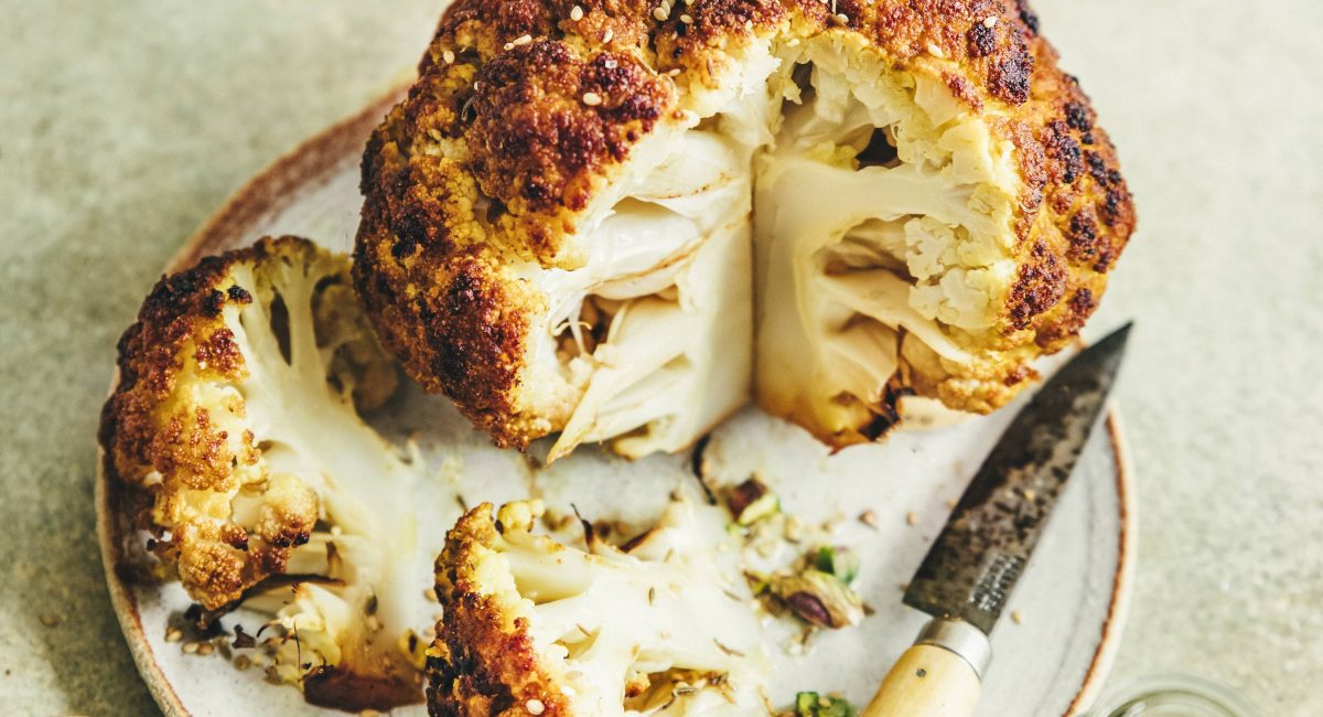 Badigeonnez le chou-fleur de cette préparation. Déposez le chou-fleur dans un plat, ajoutez l’eau et enfournez pour 30 minutes de cuisson. Couvrez de papier aluminium et poursuivez la cuisson pendant 10 minutes.