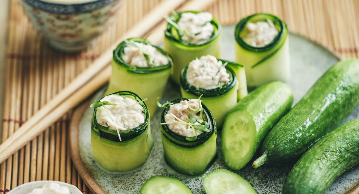 Déposez un peu de la préparation au thon sur chaque lamelle puis roulez-la sur elle-même.