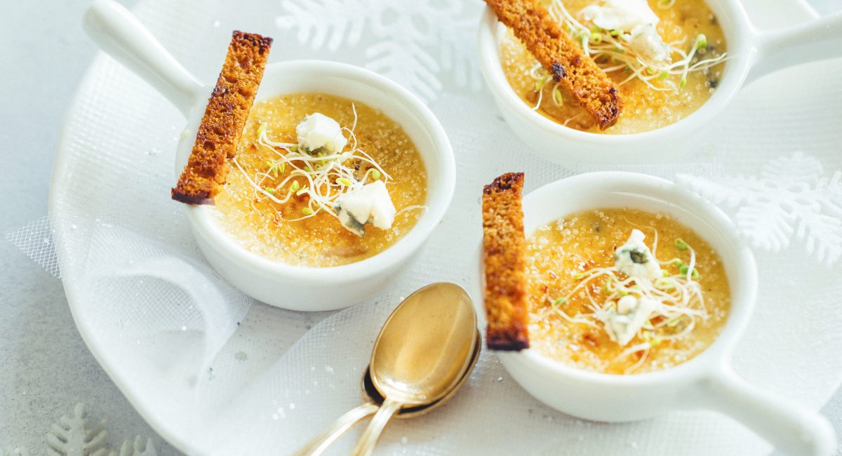 crèmes brûlées au roquefort pain d’épices et poires