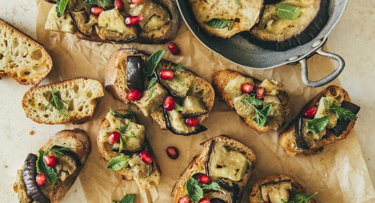 Coupez les tranches d’aubergine en petits morceaux. Dans un bol, mélangez les morceaux d’aubergine avec les herbes fraiches et les grains de grenade.
