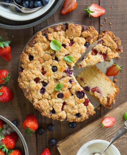 Pendant ce temps, rincez les fraises et les myrtilles. Équeutez les fraises et coupez-les en 2 ou en 4 selon leur taille. Versez la pâte au fond d’un moule préalablement beurré et fariné, ajoutez les quartiers de fraises et les myrtilles sur le dessus.