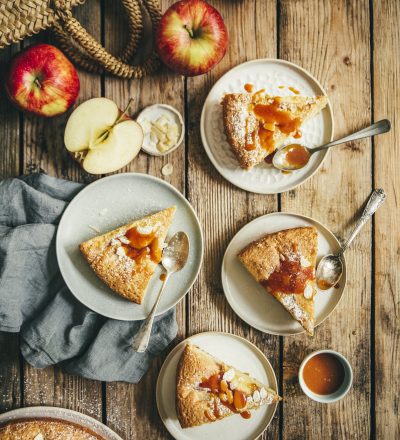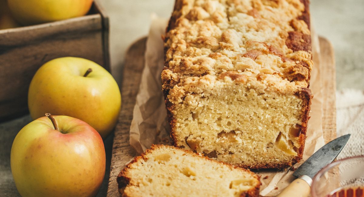 Pendant ce temps, épluchez les pommes et coupez-les en petits dés. Ajoutez les dés de pommes à la pâte, mélangez bien et versez la préparation au fond d’un moule à cake beurré et fariné.