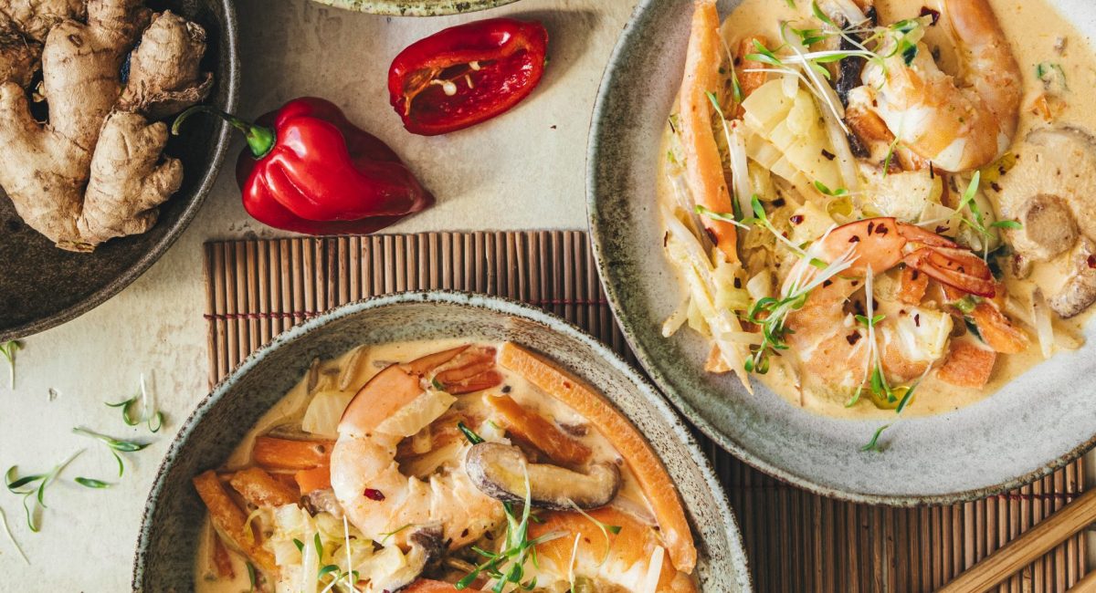 Couvrez de lait de coco, assaisonnez de sel et de poivre, puis laissez mijoter à feu doux une dizaine de minutes. Ajoutez les crevettes et poursuivez la cuisson pendant 5 minutes.