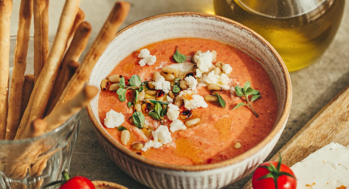 Ajoutez un filet d’huile d’olive, émiettez un peu de feta et décorez de pignons de pin. Placez au frais jusqu’au moment de servir.