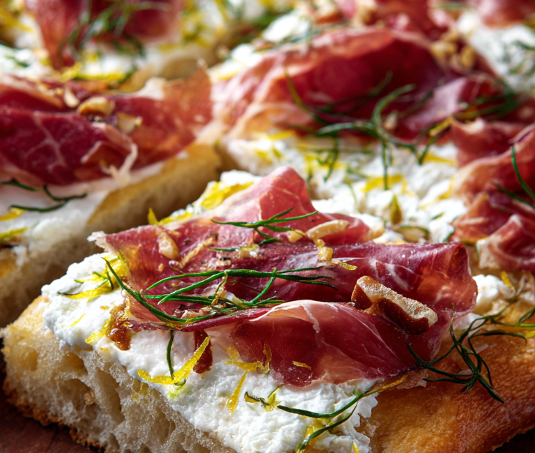 Terminez en versant un léger filet de miel sur chaque focaccia, puis assaisonnez d’une bonne quantité de poivre blanc fraîchement concassé. Servez immédiatement. Attention à ne pas saler : le fromage et la bresaola apportent déjà suffisamment de sel naturellement.