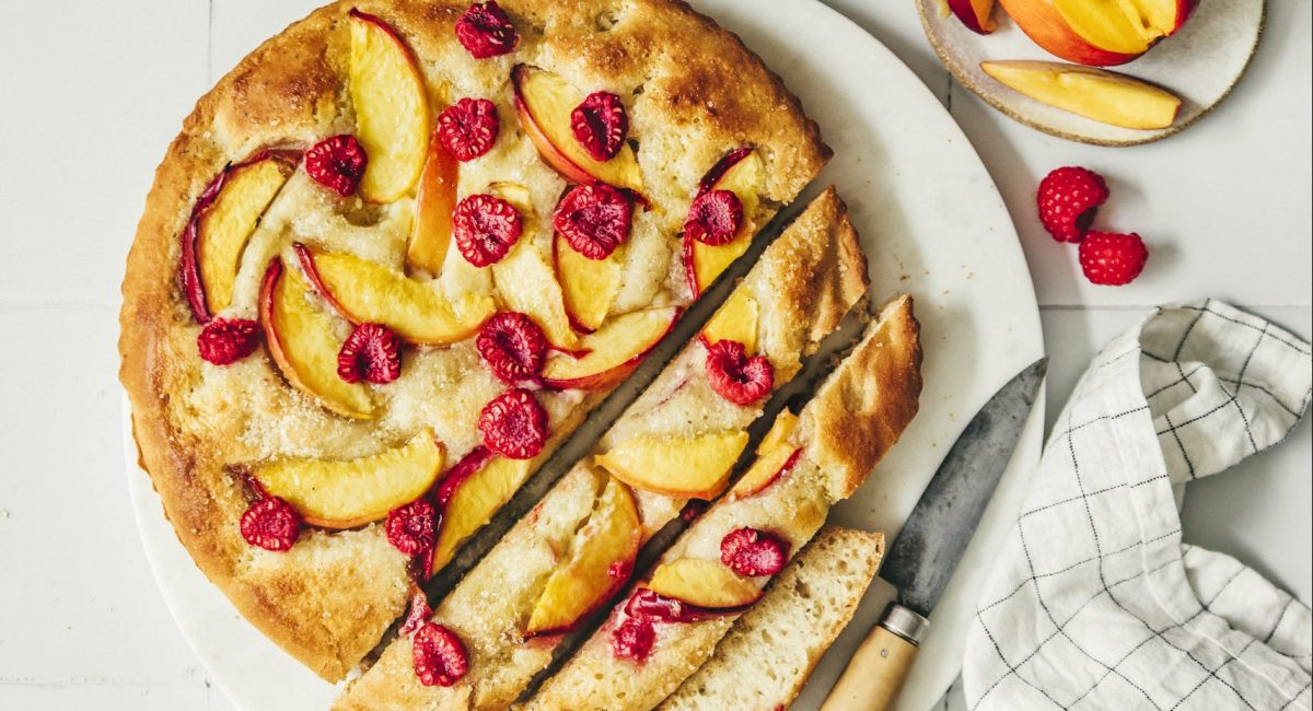 Coupez la nectarine en quartiers. Étalez la crème sur la focaccia, puis disposez harmonieusement les quartiers de nectarines. Ajoutez les framboises et saupoudrez de cassonade.