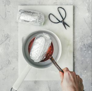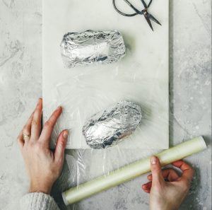Découpez un rectangle de film alimentaire et formez une ballotine avec le foie gras. Serrez bien. Enveloppez d’aluminium, puis filmez à nouveau pour bien imperméabiliser le tout. Répétez l’opération pour la deuxième ballottine.