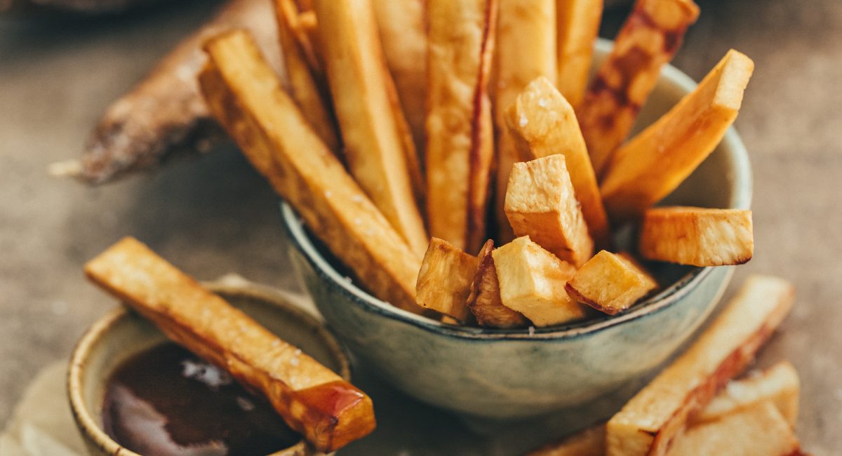 Épluchez le manioc et détaillez-le en bâtonnets bien réguliers.