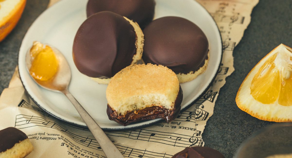 Faites fondre le chocolat au bain marie. Placez un disque de gelée encore congelée sur un disque de génoise. Nappez délicatement la gelée d’orange de chocolat fondu puis laissez au frais jusqu’à ce que le chocolat durcisse.