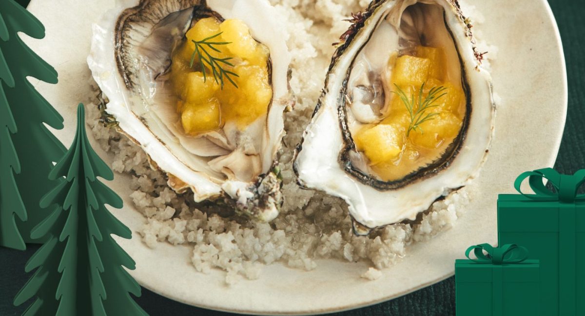 Coupez la gélatine en petit dés. Disposez quelques dés de gelée aux agrumes sur chaque huître, puis décorez le tout de quelques brins d’aneth. Servez sans attendre.