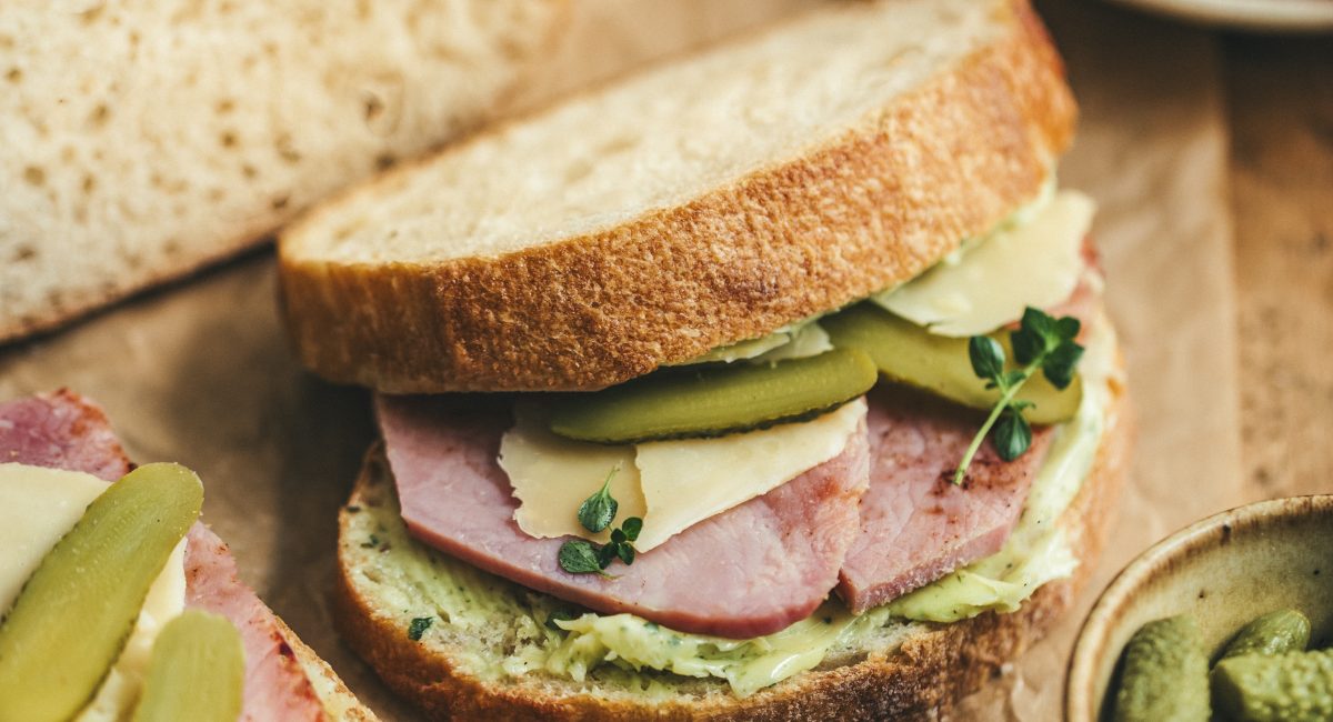 Tartinez les tranches de pain avec les beurre d’herbes. Ajoutez une tranche de jambon, les tranches fines de comté et agrémentez de cornichons.