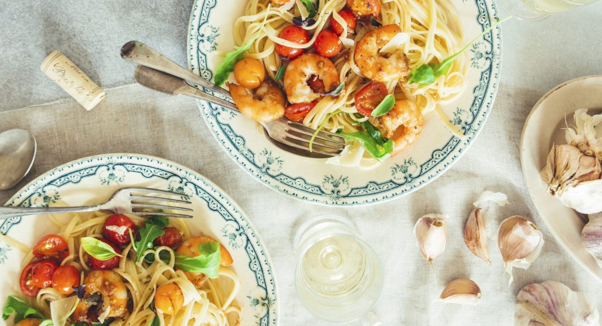 Pendant ce temps, débarrassez les gousses d’ail de leur peau et passez-les au presse-ail. Coupez les tomates cerise en deux et décortiquez les crevettes.