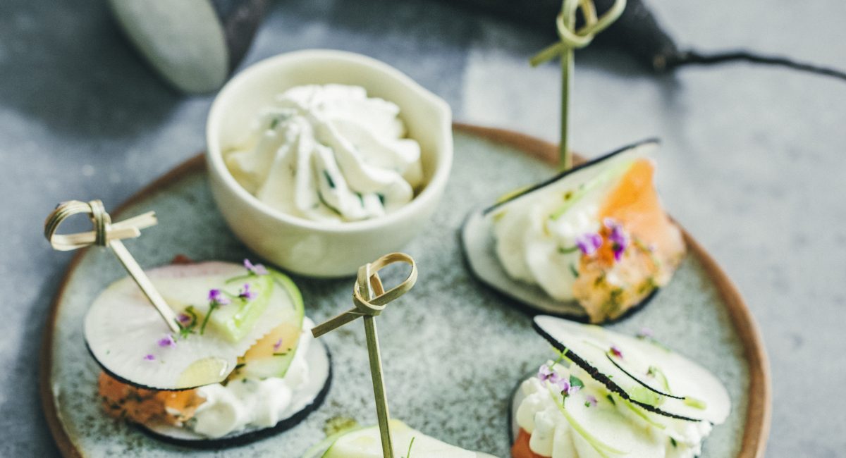 Montez les millefeuilles en alternant les rondelles de radis noir, de pommes, la chantilly au chèvre et le saumon gravlax. Faites tenir le tout avec un pic en bois.