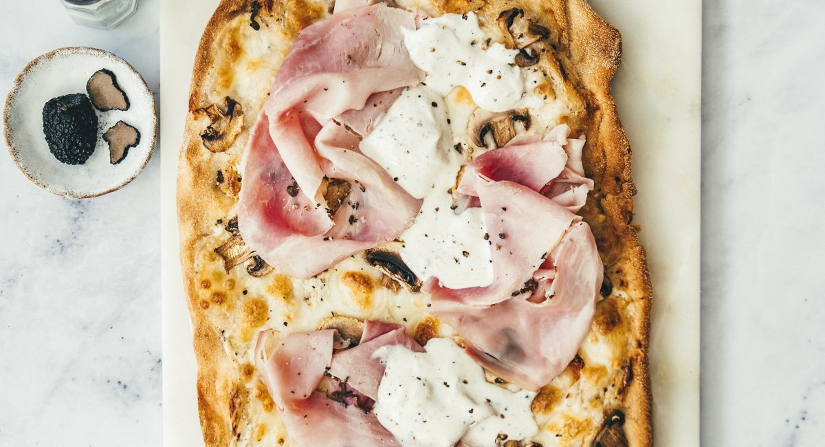 Découvrez notre recette de pinsa à la crème de truffe, champignons et jambon truffé !