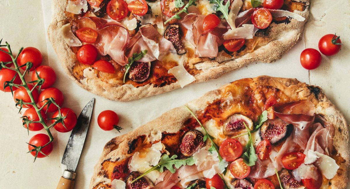 Retirez les pinsa du four et garnissez-les de speck, de roquette et de copeaux de pecorino.