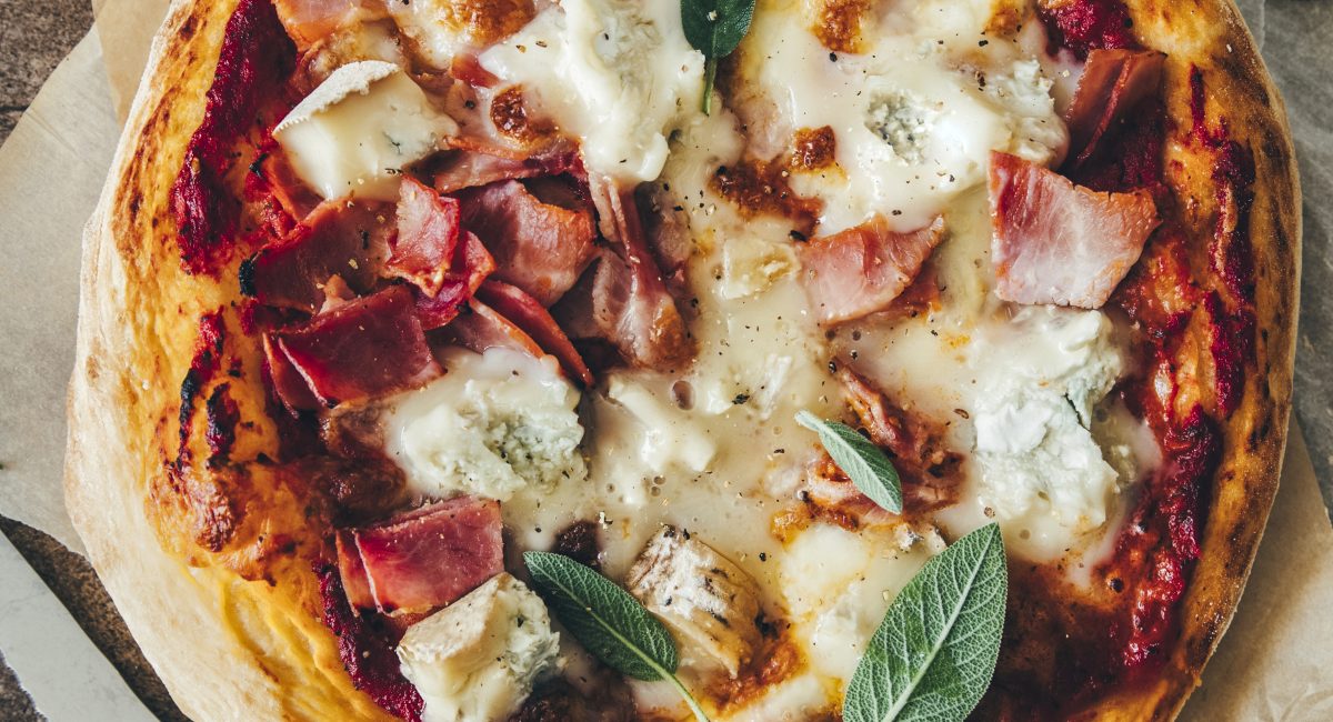 Étalez le pâton sur un plan de travail fariné et placez-le sur une plaque recouverte de papier sulfurisé. Étalez la sauce tomate basilic sur la pâte. Ajoutez le jambon, le gorgonzola et la mozzarella râpée.