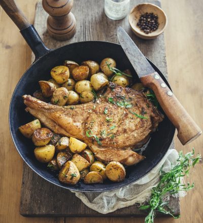 Rincez les pommes de terre à l’eau claire, coupez les plus grosses en deux ou en quatre selon leur taille. Passez l’ail au presse-ail et hachez les herbes fraiches. Coupez le lard en morceaux.