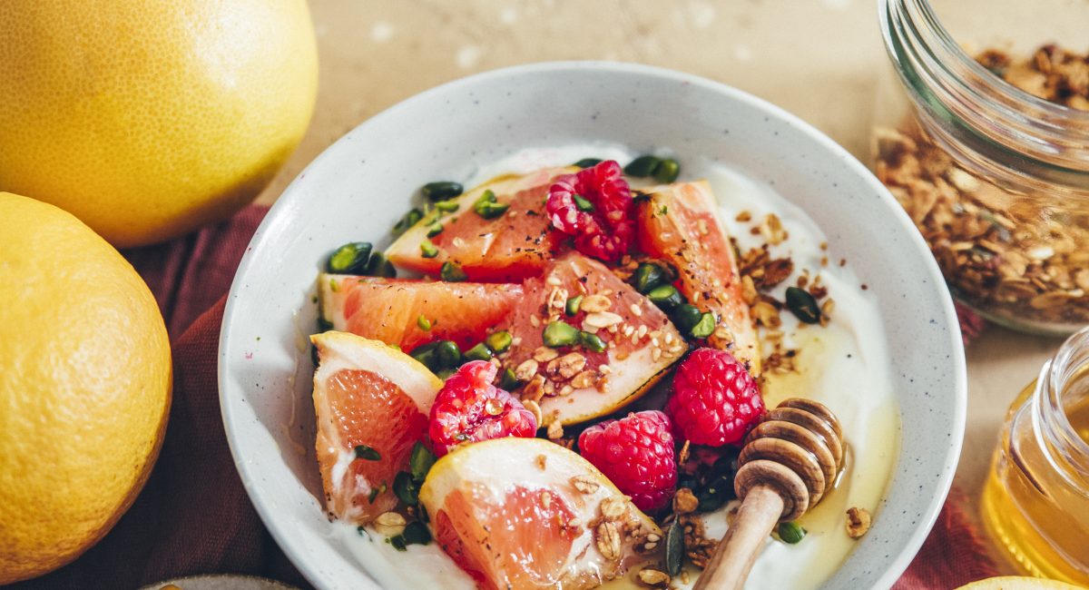 pomelos rôtis au miel, yaourt à la grecque et pistaches