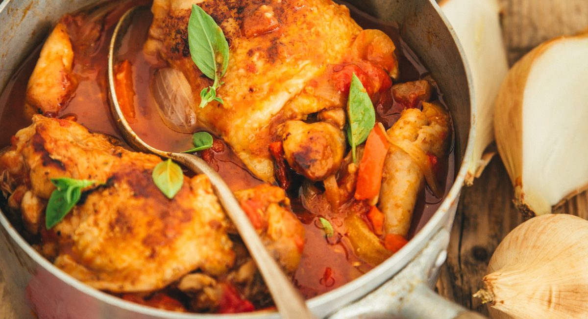 Ajoutez alors les tomates concassées, le bouquet garni et le poulet, puis assaisonnez de sel, de poivre et de piment d’Espelette.