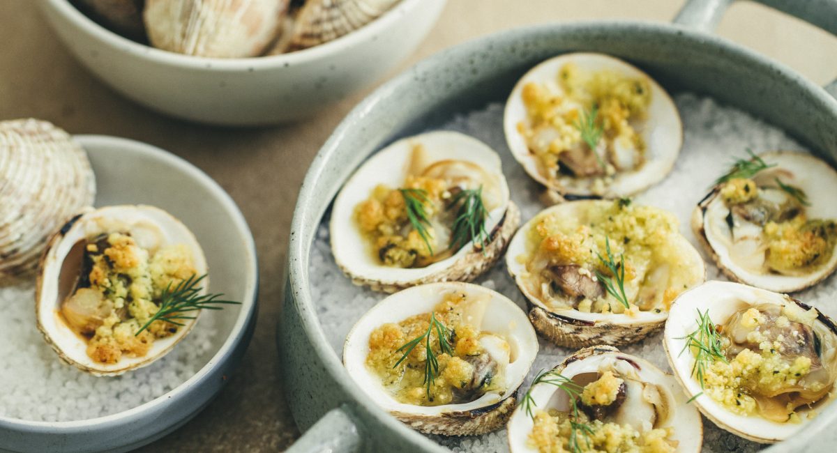 Faites tremper les praires dans de l’eau salée pendant une heure. Rincez-les à l’eau claire, puis ouvrez-les en glissant une lame de couteau entre les deux coquilles.