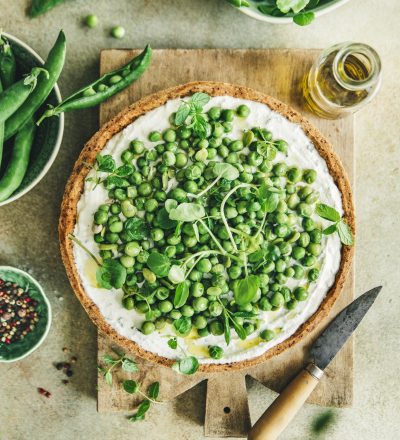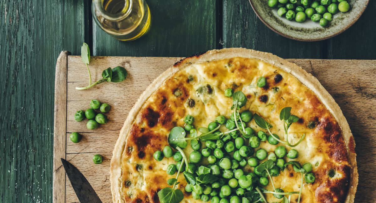 Garnissez le fond de tarte avec les petits pois, puis ajoutez l’appareil aux œufs.