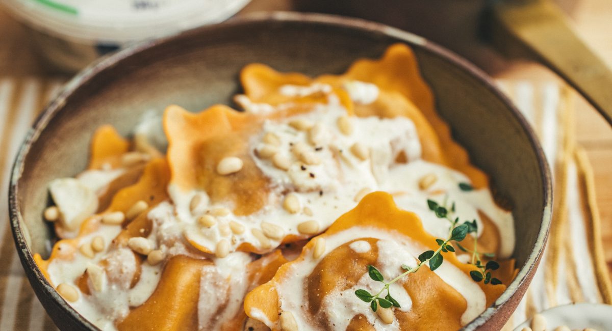 Dans une grande poêle, faites fondre le beurre. Ajoutez l’échalote fi nement hachée et faites revenir jusqu’à ce qu’elle soit translucide. Ajoutez la ricotta, la crème fraîche et le parmesan râpé. Mélangez jusqu’à obtention d’une sauce onctueuse et crémeuse. Assaisonnez de poivre et réservez au chaud.