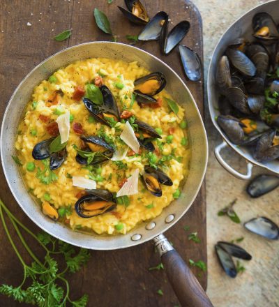 Mouillez avec le vin blanc. Lorsque celui-ci est complètement évaporé, poursuivez la cuisson en ajoutant le bouillon louche par louche à mesure qu’il s’évapore et faites cuire une douzaine de minutes