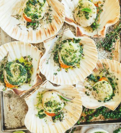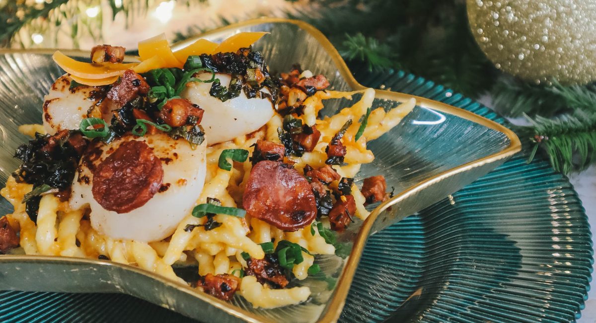En toute dernière minute, snackez les Noix de Saint Jacques dans une poêle très chaude, lorsqu’elles se décollent seules, retournez-les, ajoutez un peu de beurre et le thym et arrosez-les sur la fin de cuisson avec. Déposez les Saint-Jacques sur les trofies à la mimolette, ajoutez le condiment chorizo et dégustez immédiatement.