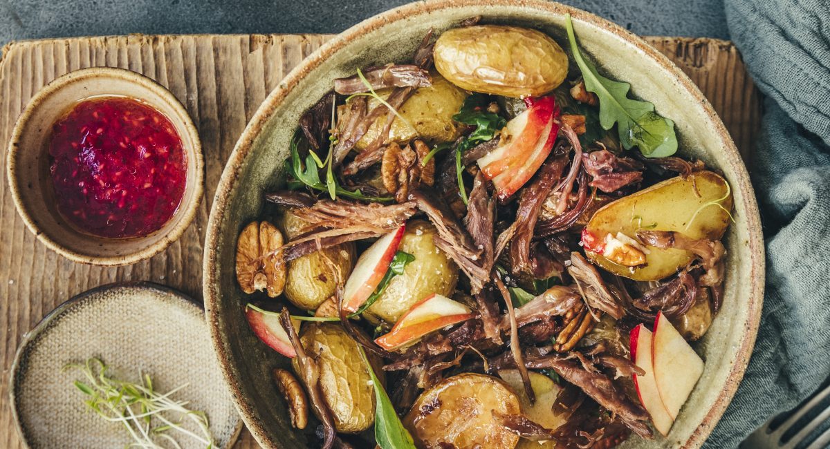 Placez les pommes de terre rôties dans un plat de service, ajoutez le mesclun, les lamelles de pomme, le canard effiloché et les noix de pécan. Arrosez de vinaigrette à la framboises et servez sans attendre