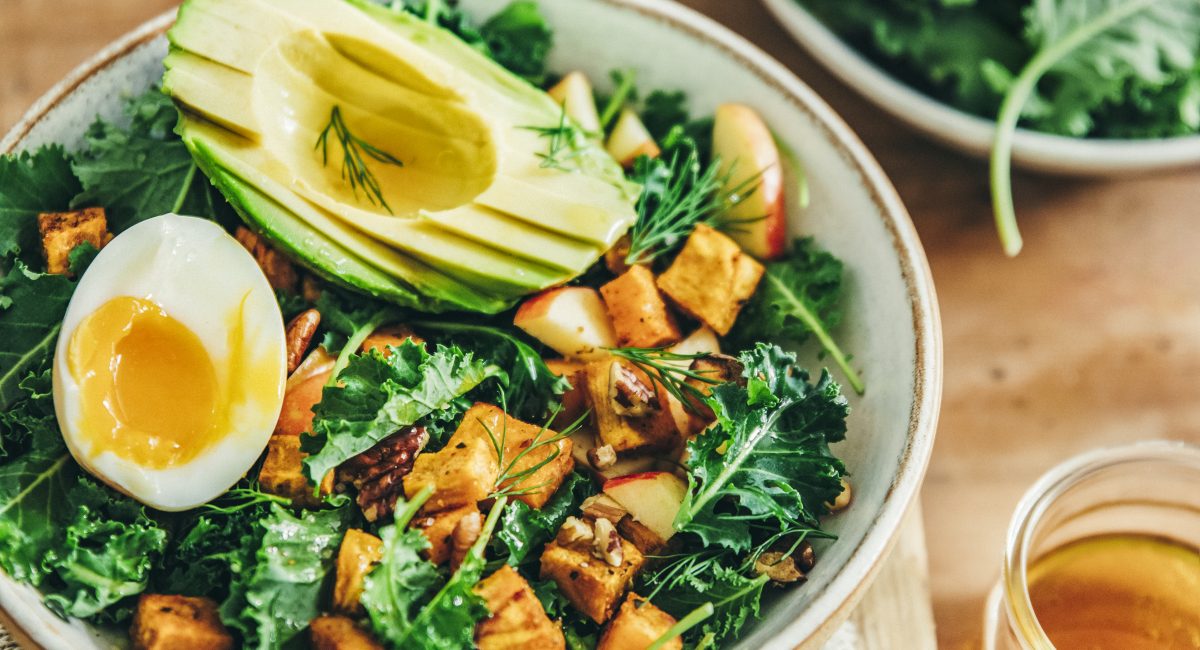 Disposez le chou kale dans un grand plat de service ou dans 4 assiettes. Ajoutez les dés de patates douces encore tièdes, les dés de pommes, les lamelles d’avocat et les œufs mollet.