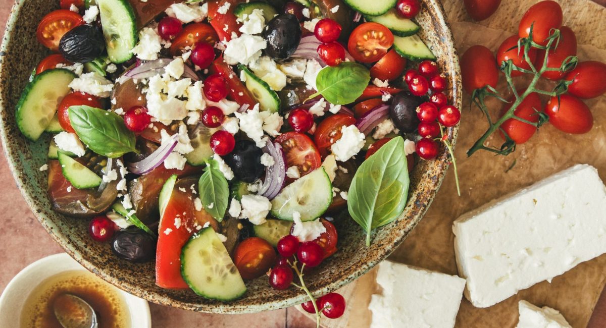 Rincez les légumes à l’eau claire. Émincez les concombres en fines lamelles. Coupez les tomates Noires de Crimée en quartiers et les tomates cerise en deux. Émincez finement l’oignon rouge.