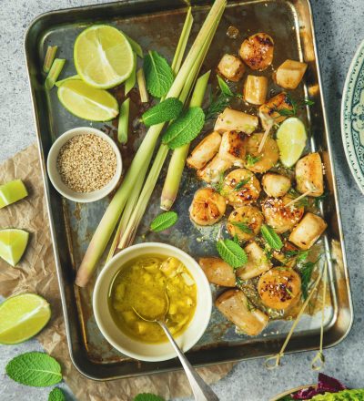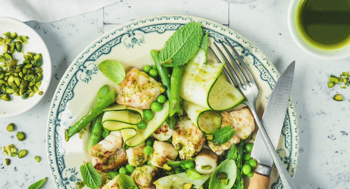 Disposez les asperges, les petits pois et les lamelles de courgette dans un plat de service ou dans 4 assiettes et ajoutez la lotte et les encornets grillés. Décorez de quelques feuilles de menthe et saupoudrez de pistaches préalablement concassées.