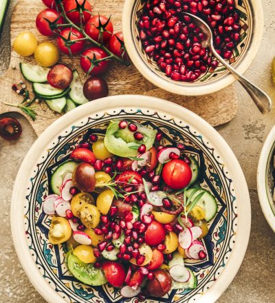 Pendant ce temps, émiettez la feta, détaillez l’oignon rouge finement et prélevez les grains de la demi grenade.