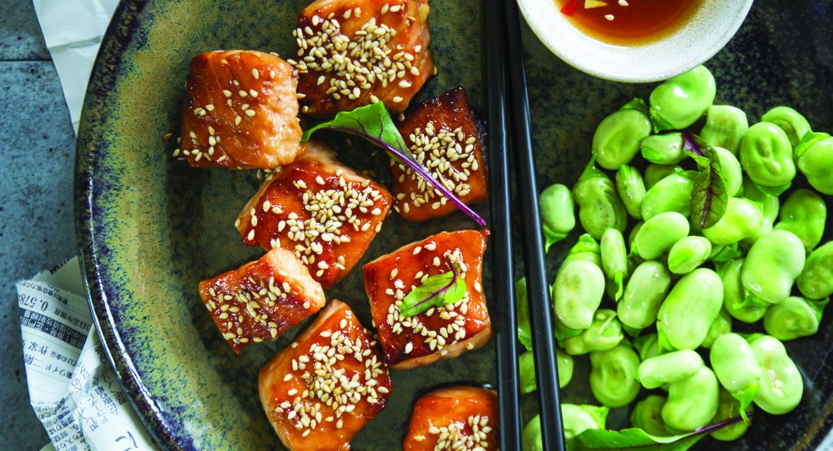 Faites chauffer l’huile dans une sauteuse. Ajoutez les dés de saumon ainsi que le reste de marinade et faites chauffer à feu vif pendant 7 / 8 minutes en remuant régulièrement. Ajoutez le sésame et servez le saumon accompagné des fèves.