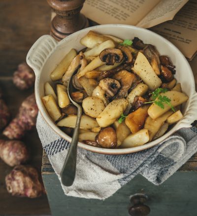 Faites chauffer un peu d’huile d’olive dans une sauteuse. Ajoutez le sauté de lapin, l’oignon émincé, les champignons et faites colorer le tout. Assaisonnez de sel et de poivre, puis couvrez de bouillon et mélangez bien.