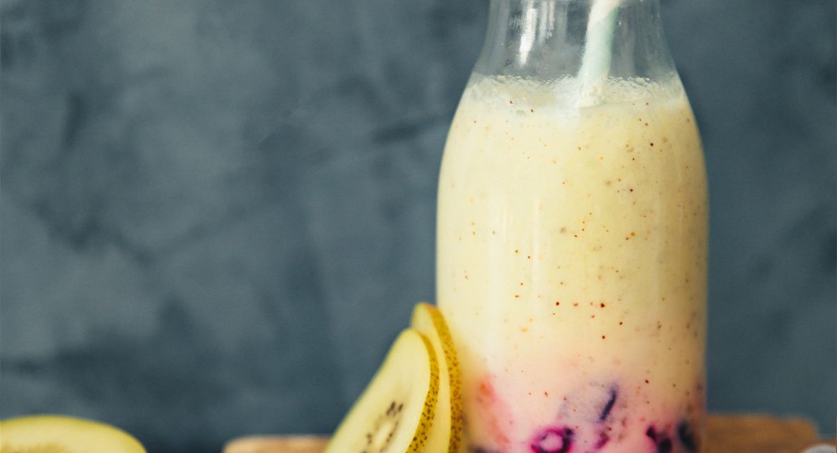 Placez les morceaux de banane et de kiwi dans un blender, ajoutez le lait d’amande et le basilic et mixez jusqu’à obtenir une préparation homogène.