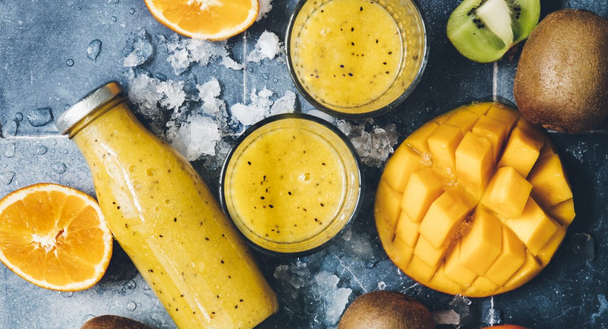 Pelez les kiwis et la mangue et coupez-les en morceaux. Pressez les oranges et le citron vert.