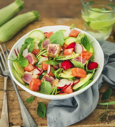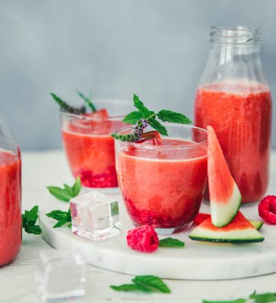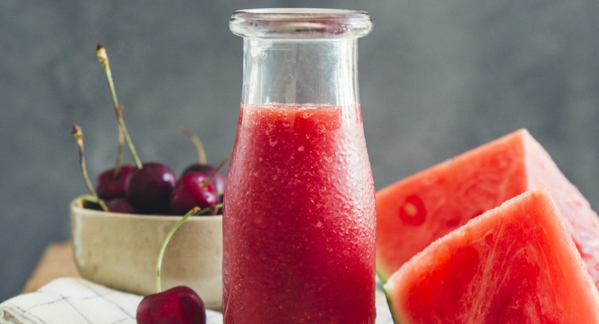 Disposez les dés de pastèque et les cerises dans le bol d’un blender.