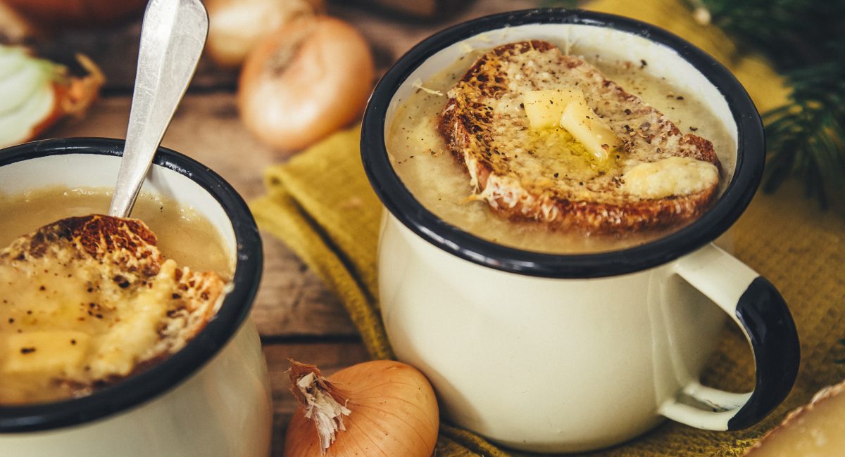Répartissez la soupe dans les bols. Ajoutez une tranche de pain dans chaque bol puis couvrez généreusement de comté râpé.